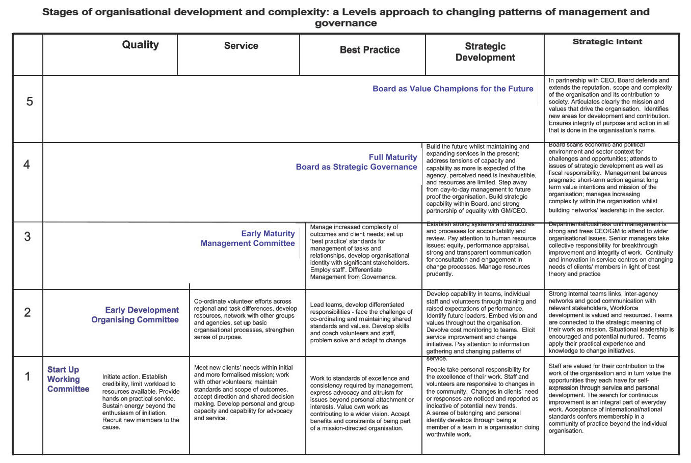 The book’s five stage developmental framework provides an interesting and useful way to facilitate a good board and staff discussion about the organisation’s birth, history and story. There are enough stories and examples to help you design and lead such a session to align views and values.