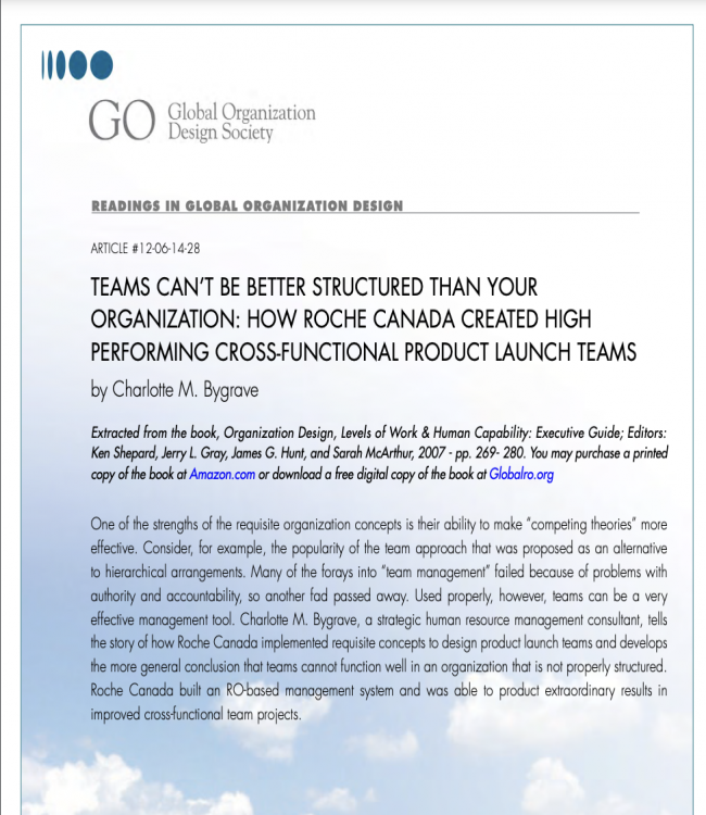 Speaker A Okay. Anyway, we had a little bit of a top heavy and fragmented functional structure that resulted from the acquisition. Marketing organization had been broken up into too many different pieces, so that needed to be redesigned. And after the new functional structure, we realized that not only was there better role design, but it led to improved working relationships and reduced the silos within the marketing area. The top heavy structure was due to the fact that after the merger there were a number of talented employees that we wanted to hang on to. So you make homes for these people because you want talent, not because you're looking at it. What's an effective organization design. So we started with looking at the structure of the organization and we realized that functional alignment was necessary. But Roche had the correct number of organization levels. Once we understood the unique contribution or the level complexity of work that was to be completed at each organization level, our challenge was making sure on an ongoing basis that the complexity of the work matched the levels of the organization and human capability was matched to the levels of complexity of work. One of the ways that we would do that, level five, it was a strategized organization. Yes. One of the ways, of course, to keep the work and the levels balanced was through the strategic planning process. Again, Roche was fairly adept at strategic planning, but one of the things that Elliot and Nancy helped us do was to strengthen that process. Our president now was very much in love with the balance work card approach, but did not want to implement it unless it was consistent with requisite organizations. Elliot, Nancy and I came back and told him, yes, it was they didn't tell you how to do it in a multi functional, multi level organization. So the improvements we made to the strategic planning process had to do with making sure that the company business plan was translated into functional plans and that those functional plans all had strat, appropriate objectives. It was one of the ways of, again, keeping the work aligned with the structure, the business plan integrated with the operational plan, which was then integrated with the performance management system. Another area that we focused on in the assessment, of course, was cross functional working relationship. Intense collaboration is required in the pharmaceutical industry to produce and launch products. So it meant millions of dollars a day to the organization's top line to be able to launch those new products effectively. So the President, the way we looked at the cross functional accountability and authorities was, let's not try and put an authority on every task or accountability in every role. Let's look at where we're having some major issues in the organization and shoot for solving those. So it kind of took what are 20% of the problems or issues that are solved? You resolve those, you're well on your way to major issues. We had the framework in place. You now knew how to look for problems due to lack of cross functional clarity. In addition to that, another major piece, of course, was the establishment of product launch and development teams. Our president had used these kinds of teams in other pharmaceutical organizations and realized their value. So we quickly set up the teams that all kinds of hurdles perform. Well, people were very pleased to come and chose to participate on the team, but clearly over time, things were not working out. Teams were reporting to the executive committee. There wasn't a lot of support from their home based managers for their participation on the team. Given the amount of time they were spending on the teams. They were also concerned about compensation, performance management and their career development. One of the things that Elliot helped Roche do, which was really critical, I think one of the first areas where there was significant short term strategic payoff and would have been even greater long term strategic payoff was in establishing the project and coordinative team structure. As smart as he was, our situation initially brought furrowed brow to his face as he tried to figure out what was going on in the organization in terms of getting our functions, clinical research, marketing, sales to work together and solution came up with. He said you actually need two different kinds of teams and one team will transform itself over time into second type of team. First team was a product launch team and this is a typical project manager team. They're going to study a problem and make a recommendation to the executive group and once that recommendation was accepted, now you're going to launch into business plans and actions that would have impact across the organization. So coordinated team would need to be put in place to ensure that the work of the various departments to get the launches off and running was in safe conditions, timing and resources. About two months or three months into this whole process, it does take a while to get everything settled down. Delegation, clear accountability authorities, not only within a team, but between the team and the rest of the organization. But it was one of the areas in which Rose started to see some immediate payoff. Steve is sitting in the or, Julian sitting there again. Just to summarize on the product launch team, what was most important, establishing clear accountability authorities of the accountable executives. This was ultimately accountable. The president is ultimately accountable for the teams that launch these new products. Obviously we're not going to report ten or twelve teams to the president, so that authority was delegated, verified the authority of the home based managers and also other functions, team leaders and members. We set up selection criteria. People just wonder, well, how do you get to be on a team, how do you get to lead the team? It must all be polit