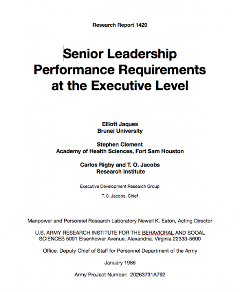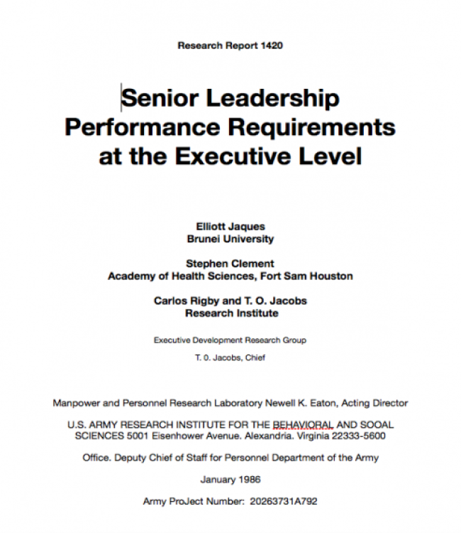 Member for 3 years 1 month Elliott Last Name Jaques Clinical researcher in organization design Requisite Organization International Institute - deceased Address United States Member for 17 years 8 months Stephen D. Last Name Clement User Type Citizen Affiliate GO Society Roles Internation Advisor - United States (2005-present) President/Founder Organizational Design, Inc. (ODI) Address Afghanistan Member for 17 years 7 months T. Owen Last Name Jacobs User Type Citizen Affiliate Principal and Co-Founder Executive Development Associates Address Afghanistan Price no charge Get this book 03-US_ARI_Early_Sr_Leadership_Study_Overview-Jaquesetal.pdf United States Elliott Jaques Date 1986 Downloadable Downloadable from this website Publisher US Army Research Institute